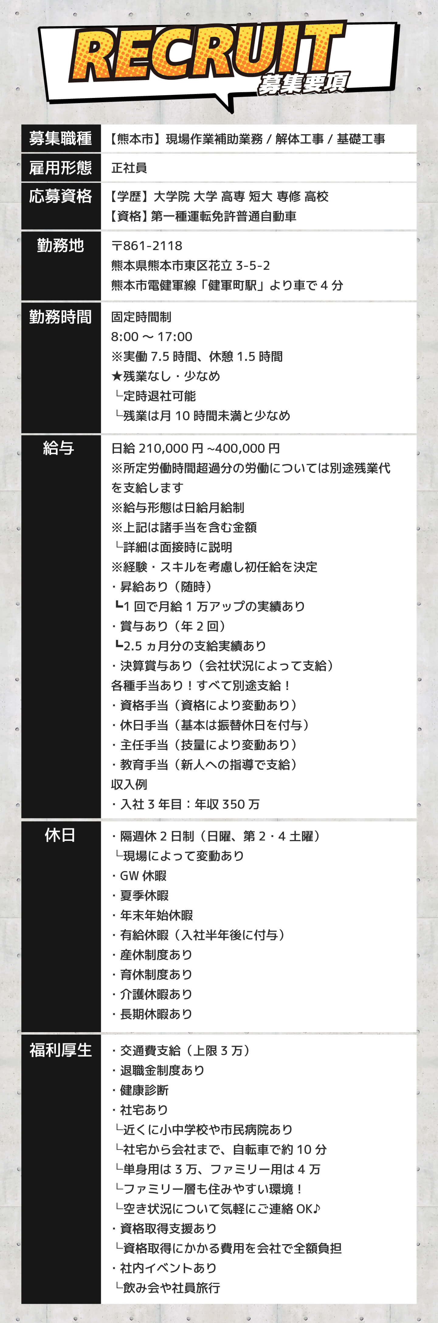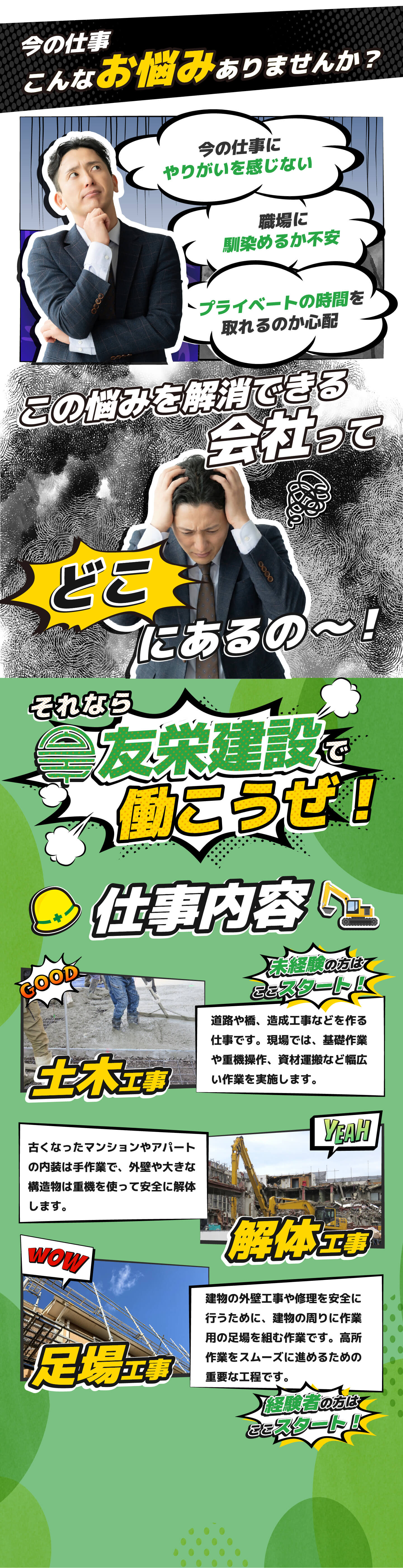 | 事業内容 | 公共建設 マンション建築工事 道路補修工事 解体工事 |